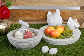 Für den Frühling und die Ostertage giesst du Schalen aus Beton, die sich unter anderem als tolle Osternester eignen. Huhn und Hase gehören ebenfalls zum Kurs – und auch bunte Eier! Das Dekorieren und Füllen überlassen wir dem Osterhasen. Das Fest mit dem Nest kann losgehen!